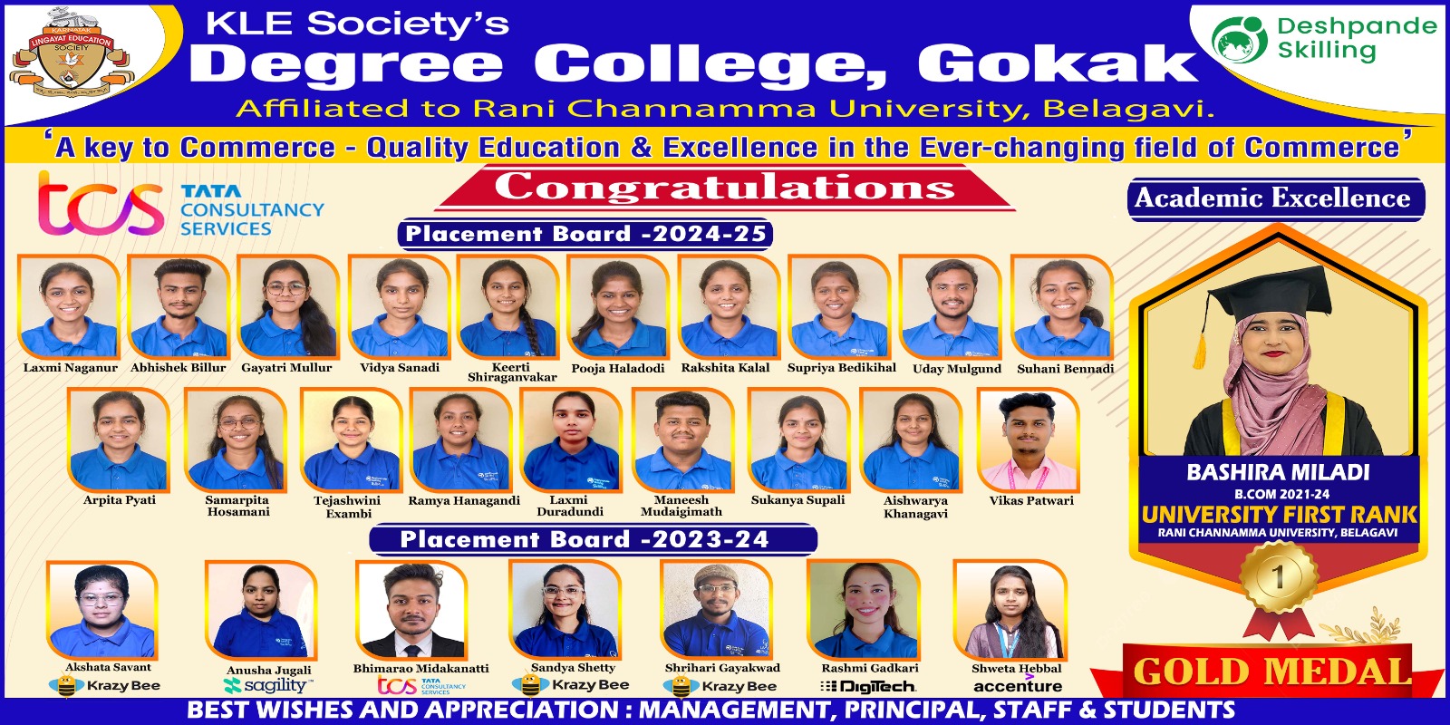 KLE Society’s Degree College, Gokak, founded by the Karnataka Lingayat Education Society in the year 2019, to provide quality education and excellence in the ever-changing field of Commerce. It is recognized as a vibrant institution working relentlessly for the cause of education in the beautiful city of Gokak. The college is granted affiliation from Rani Channamma University, Belagavi in the year 2019. The new campus has well-equipped classrooms. The college building accommodates the needs of all the stakeholders. The college dreams of acquiring a national identity and the students having a global outlook carving a niche for them in the specialized field of Commerce and we strive to keep the legacy of our KLE Society by imparting values, knowledge, and wisdom to our Students.